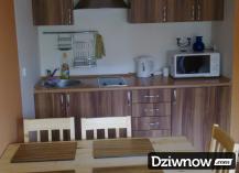 Jadalnia połączona z aneksem kuchennym, wyposażonym w płytę ceramiczną, czajnik elektryczny, lodówkę i kuchenkę mikrofalową oraz pełną zastawę kuchenną.